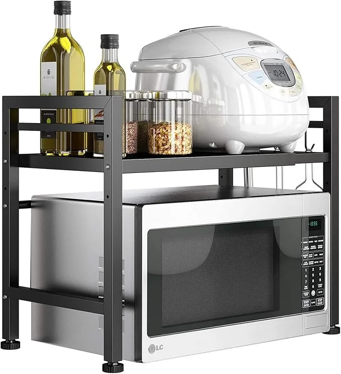 This expandable microwave shelf is a great way to keep your kitchen organised and make better use of space. It creates extra storage for appliances, cookware, and pantry items, helping reduce clutter on your countertops. The adjustable design lets it fit different spaces, while the sturdy frame holds heavier kitchen essentials with ease. With added hooks for small items, it keeps everything within reach and makes your kitchen feel more tidy, functional, and easy to use every day.